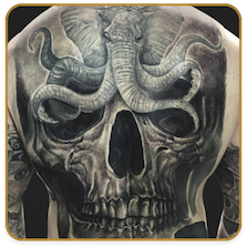 Originario de la Ciudad de México. Artista Visual, dibujante, pintor y escultor, tatuando desde 1997. Tatuador de Freehand, Realismo en Color y Black & Grey, Sombras con elementos de color, Dark Art y Estilo Prehispánico.